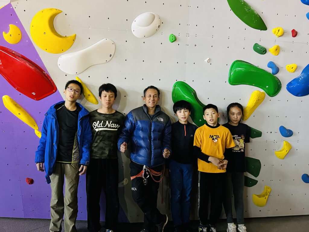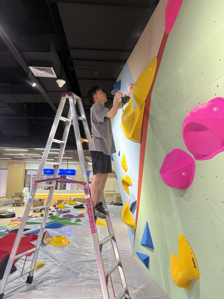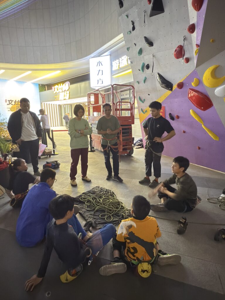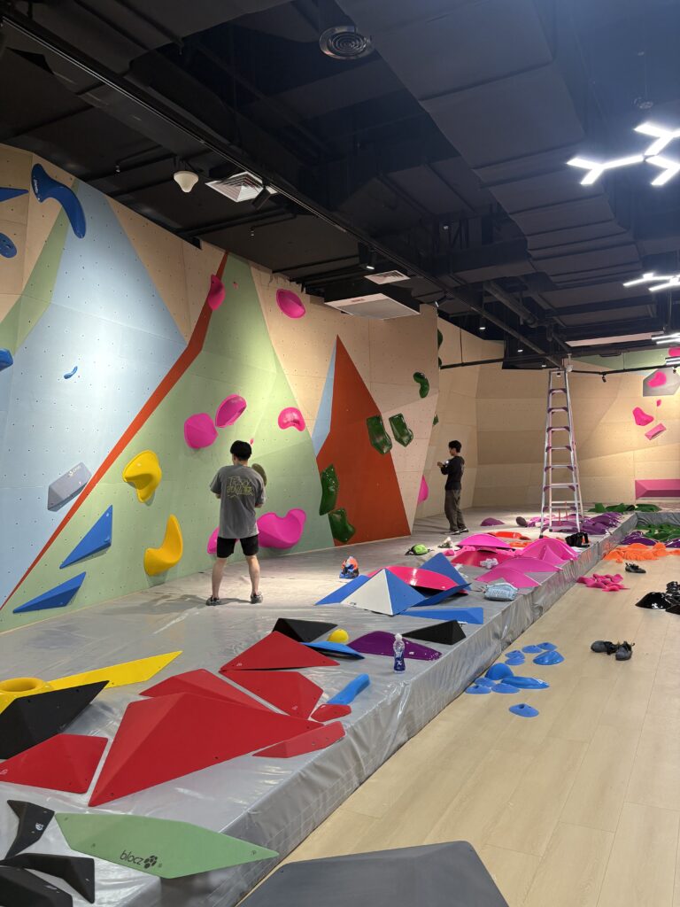 1号店のボルダー壁を使ってリードの為のトレーニング方法を指導したり、